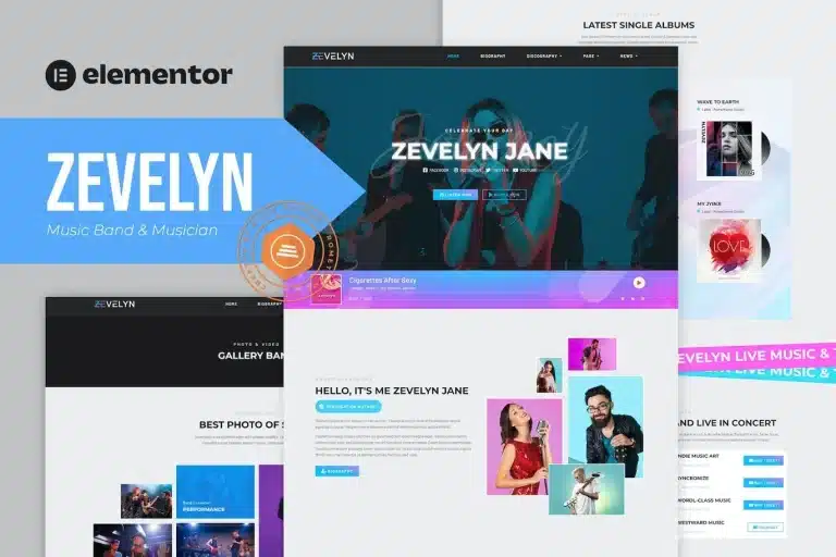 Zevelyn es un Kit de Plantillas Elementor diseñado especialmente para Bandas Musicales y Músicos. Este kit de plantillas incluye una selección ideal para música, artistas, audio, bandas, canciones y DJs. Con un diseño moderno y creativo, totalmente receptivo (100%), fácil de instalar y personalizar gracias al uso de Elementor, por lo que no necesitas escribir ni una sola línea de código.